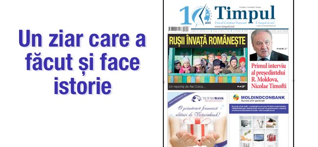 În timp ce prețurile la combustibil, energie, hârtie sau tipar au crescut uimitor în ultimii zece ani, TIMPUL a făcut tot posibilul pentru a menține un preț al ziarului accesibil pentru toți (3 lei – COTIDIAN și 5 lei – SĂPTĂMÂNAL) . Pentru că timpul trece, cumpără mai bine ziarul astâzi şi nu aștepta tocmai până luni ca să citești pe site TIMPUL.MD articolele de mai jos.