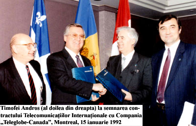 Dupa proclamarea Independentei R. Moldova, Timofei Andros a fost initiatorul si organizatorul elaborarii conceptiei de modernizare a retelelor de telecomunicatii, radio si televiziune in baza tehnologiilor avansate din tarile occidentale. In acest scop, in octombrie 1991, la Expozitia internationala de la Geneva, semneaza cateva documente de colaborare cu firme de telecomunicatii cu renume mondial. Ca rezultat al acestor colaborari, in ianuarie 1992 incheie doua contracte de organizare a serviciilor internationale de telefonie a Moldovei: cu Compania „Teleglobe-Canada” – pentru serviciile de telefonie intre Moldova si tarile din America, Asia si Africa, si cu Compania „Telecom-Denmark” – pentru servicii cu tarile din Europa (exceptie Romania, Bulgaria si tarile ex-URSS), toate cheltuielile fiind suportate de companiile mentionate. El a fost cel care a facut ca cetatenii R. Moldova sa aiba posibilitatea sa asculte BBC si „Europa Libera”.