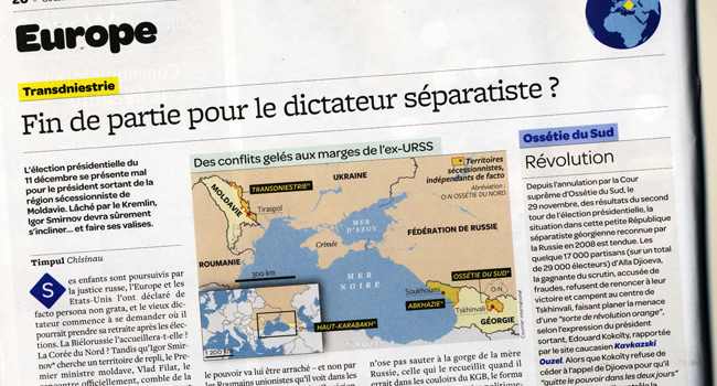 Sâmbăta trecută, ziarista Iulia Badea Guéritée de la prestigioasa revistă franceză „Courrier international” – sosită de la Paris, împreună cu colega ei de la redacţia olandeză, Judith Sinnige, pentru a reflecta „alegerile” din Transnistria – îmi înmâna cu mândrie ultimul număr al publicaţiei, cu menţiunea: „Sunteţi şi voi acolo!”. Se referea la articolul colegului Marin Basarab, „Agonia dictatorului separatist sau ultima sută de metri a „regelui” Smirnov”, publicat în TIMPUL din 29 noiembrie şi preluat de „Courrier international” cu titlul „Sfârşit de partidă pentru dictatorul separatist?”.