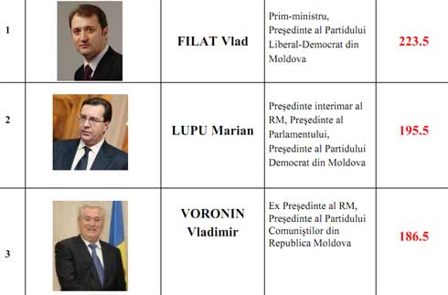 Pe primele zece poziţii se află ministrul Afacerilor Externe şi Integrării Europene, Iurie Leancă (185,5 puncte), primarul mun. Chişinău, Dorin Chirtoacă (178 puncte), ministrul Justiţiei, Alexandru Tănase (174,5 puncte), preşedintele PL, Mihai Ghimpu (168,5 puncte), deputatul PLDM, Mihai Godea (165 puncte), ministrul Economiei şi Comerţului, Valeriu Lazăr (156,5 puncte) şi deputatul PCRM, Igor Dodon (145,5 puncte).