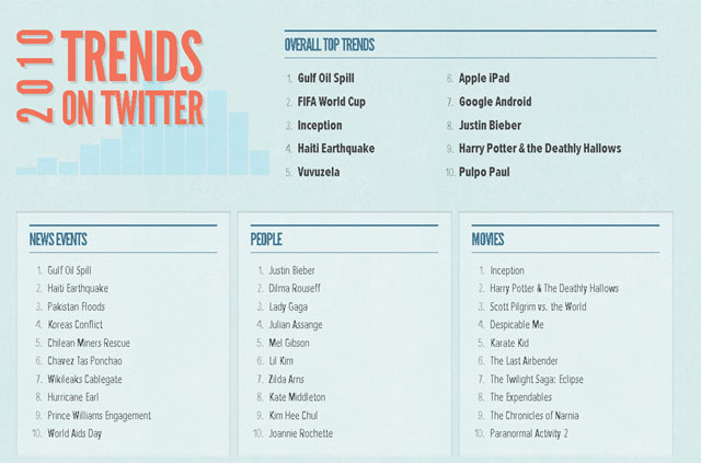 Potrivit publicaţiei electronice Mashable, Topul celor 10 teme de pe twitter descrie foarte bine ceea ce a interesat lumea pe parcursul acestui an, în comparaţie cu lista oferită de Google, în ceea ce priveşte cele mai căutate domenii.