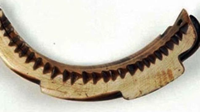 Fabricat din coltele unui mistreț sălbatic, decorat cu gravuri, care probabil desemnează ciclul lunar cu durata de 28 zile și cele patru faze ale lunii.