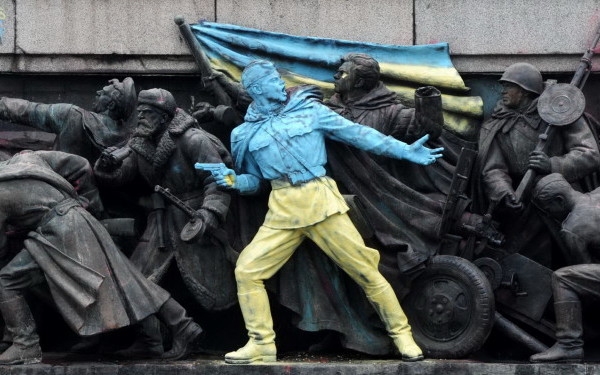 Un artist bulgar a vopsit în culorile Ucrainei statuia dedicată soldaţilor sovietici din Sofia