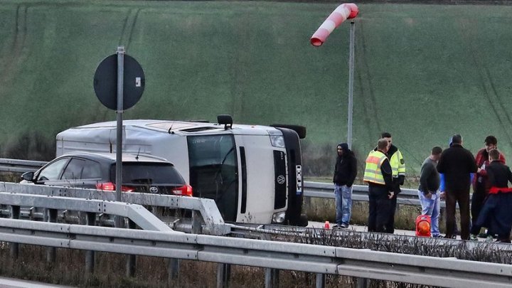 Potrivit poliției germane, după ce a frânat, microbuzul s-a învârtit de câteva ori și apoi s-a răsturnat.