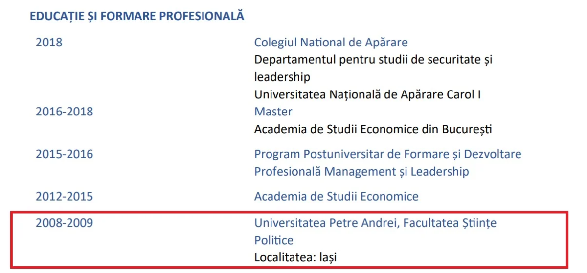 De asemenea, ministrul Transporturilor mai susține că a urmat Programul Postuniversitar de Formare și Dezvoltare Profesională Management și Leadership între 2015-2016, dar și un master la Academia de Studii Economice, între 2016-2018, perioadă în care era deja deputat.