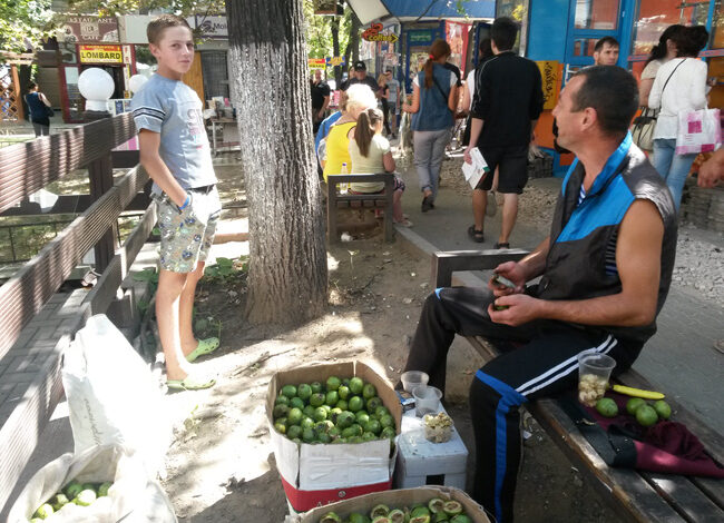 Și pe bulevardul Ștefan cel Mare și Sfânt comerțul înflorește. Mese cu diferite chițibușuri, flori, ochelari, bijuterii hand-made. Un bărbat curăță de zor nuci, iar fiul le vinde. Mai au de isprăvit o jumătate de sac. Mâinile bărbatului sunt mult mai negre, iar fața – arsă de soare. Vitalie, tatăl, spune că vara asta a adus foarte multe nuci, adică vreo 15-20 de saci. „Facem zilnic câte 500-600 de lei. Cu banii cumpărăm de școală, de îmbrăcat, facem în casă reparație”, povestește mândru negustorul.