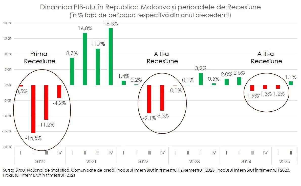 Potrivit expertului, evoluția negativă a PIB-ului indică în mod clar o recesiune, iar pentru cine analizează datele cu onestitate, aceasta reprezintă „a treia recesiune din ultimii cinci ani”, un fenomen care reflectă starea tot mai fragilă a economiei moldovenești.
