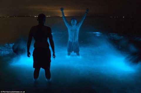 Un fotograf de 34 de ani a setat aparatul de fotografiat la o viteză foarte mică şi au aruncat nisip şi pietre în apă pentru a provoca reacţia. Aceste imagini uimitoare arată astfel din cauza concentraţiei mari a micro-organismului "Noctiluca Scintillans".