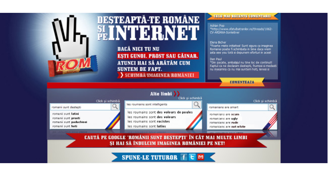 Scopul campaniei "Românii sunt destepţi", iniţiată de ROM, prin McCann Erickson, este ca până la Ziua Naţională a României să reuşim să schimbăm lista rezultatelor din Google referitoare la români.