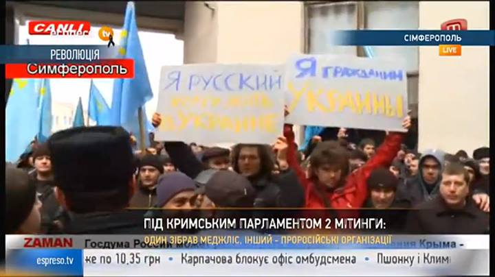 La moment, între cele două grupări de protestatari s-a început o încăierare verbală. Tătarii îi depășesc numeric, sunt aproximativ cinci mii, astfel, reușesc să acopere strigătele pro-rușilor.