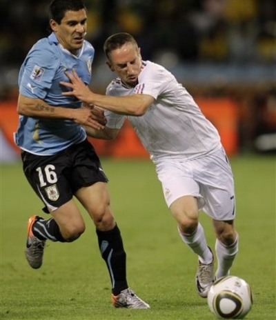 Dar francezii, în linii mari, au dispersat aceste sumbre perspective. În orice caz, în prima repriză. Posesie cvasitotală a balonului, activism exagerat şi o serie de ocazii de gol, sunt ingrediente care păreau străine jocului actual al selecţionatei „cocoşului galic”. Deosebit de periculos părea a fi Frank Ribery care făcea legea pe extrema stângă, fără a fi anihilat de către cei doi „protectori” uruguayeni ai săi. Unicul accesoriu care le lipsea francezilor până la pauză era o organizare disciplinată a acţiunilor ofensive, care le-ar fi permis să-şi motiveze eforturile depuse. În particular, mai mult sau mai puţin, fiecare jucător al lui Domenech a jucat la un nivel înalt. Dar pentru a solidifica un colectiv, francezilor ceva nu le ajungea.