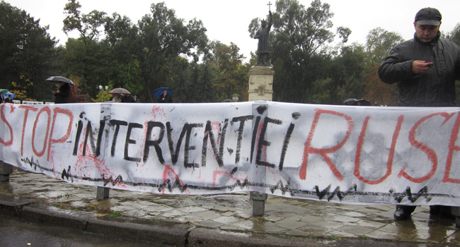 După Sfânta Liturghie, Patriarhul Kirill urma să depună flori la monumentul lui Ştefan cel Mare şi Sfânt. Cu o oră înainte, vreo zece tineri au venit cu bannere prin care încercau să protesteze împotriva scopurilor politice pe care le conţine vizita conducătorului bisericii ruse. Protestatarii au ţinut în mâini pânze lungi pe care scria cu litere spălate de ploaie „Stop intervenţiei ruse”, „Republica Moldova nu este o provincie a Sfintei Rusii”, „Tovarăşe Patriarh, religia nu e politică” etc.