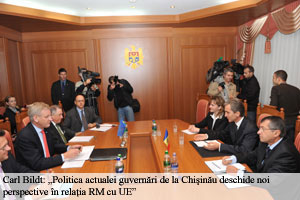 „Dupa cum stiti, UE a decis sa initieze negocierile asupra unui nou acord cu RM, care va fi unul foarte ambitios, a declarat, la randul sau, Carl Bildt. Nu conteaza denumirea. Important este sa avem un nou Acord. De asemenea, vom negocia si un Acord in domeniul comertului. Despre liberalizarea regimului de vize noi discutam si in cadrul altor formate, cum ar fi Parteneriatul Estic”. Referindu-se la suportul pe care intentioneaza sa-l acorde Uniunea Europeana, Carl Bildt a specificat: „Ati mostenit o economie foarte dificila. UE si institutiile europene sunt aici pentru a va ajuta.