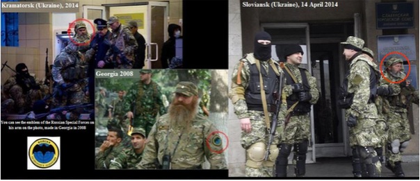 O serie de fotografii furnizate de Kiev prin intermediul Organizaţiei pentru Securitate şi Cooperare în Europa (OSCE) arată o imagine realizată în Georgia în 2008 a unui militar cu barbă roşcată, purtând insigna unei unităţi a forţelor speciale ruse.